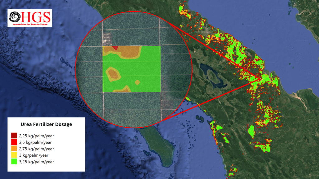 Based on nutrient distribution and established agronomic standards, HGS produced fertilization maps recommending site-specific dosages of Urea, TSP (Triple Super Phosphate), MoP (Muriate of Potash), and Dolomite. These recommendations are tailored to plantation age, nutrient status, and productivity targets. By using these maps, palm oil companies or end-users can increase the effectiveness of fertilization and reduce costs associated with fertilizer purchases, ultimately helping to improve company profits and strengthen the overall palm oil industry.